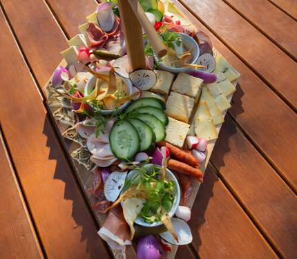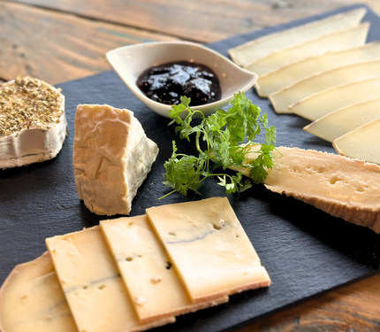 Poêlon de camembert rôti aux amandes, origan, ail. Accompagné de pommes de terre grenaille, pommes, poires et abricots - Fait maison.